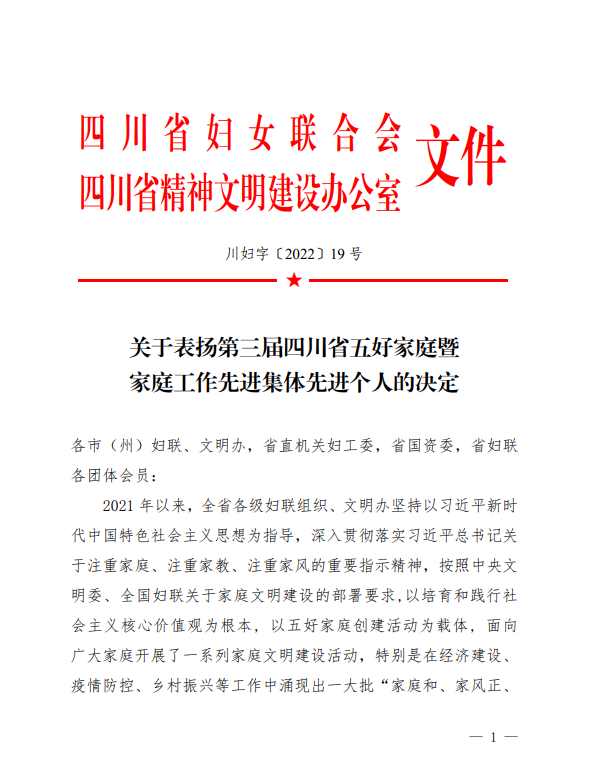 为深入贯彻落实习近平总书记关于注重家庭家教家风建设的重要指示精神,四川省妇联、省文明办以培育和践行社会主义核心价值观为根本,以评选五好家庭、寻找“最美家庭”活动为载体,在“5.15”国际家庭日来临之际,表彰了一批四川省五好家庭、“最美家庭”和家庭工作先进集体、先进个人,雷竞技raybet官网版下载成为荣获“四川省家庭工作先进集体”荣誉称号中唯一的高校参评单位!