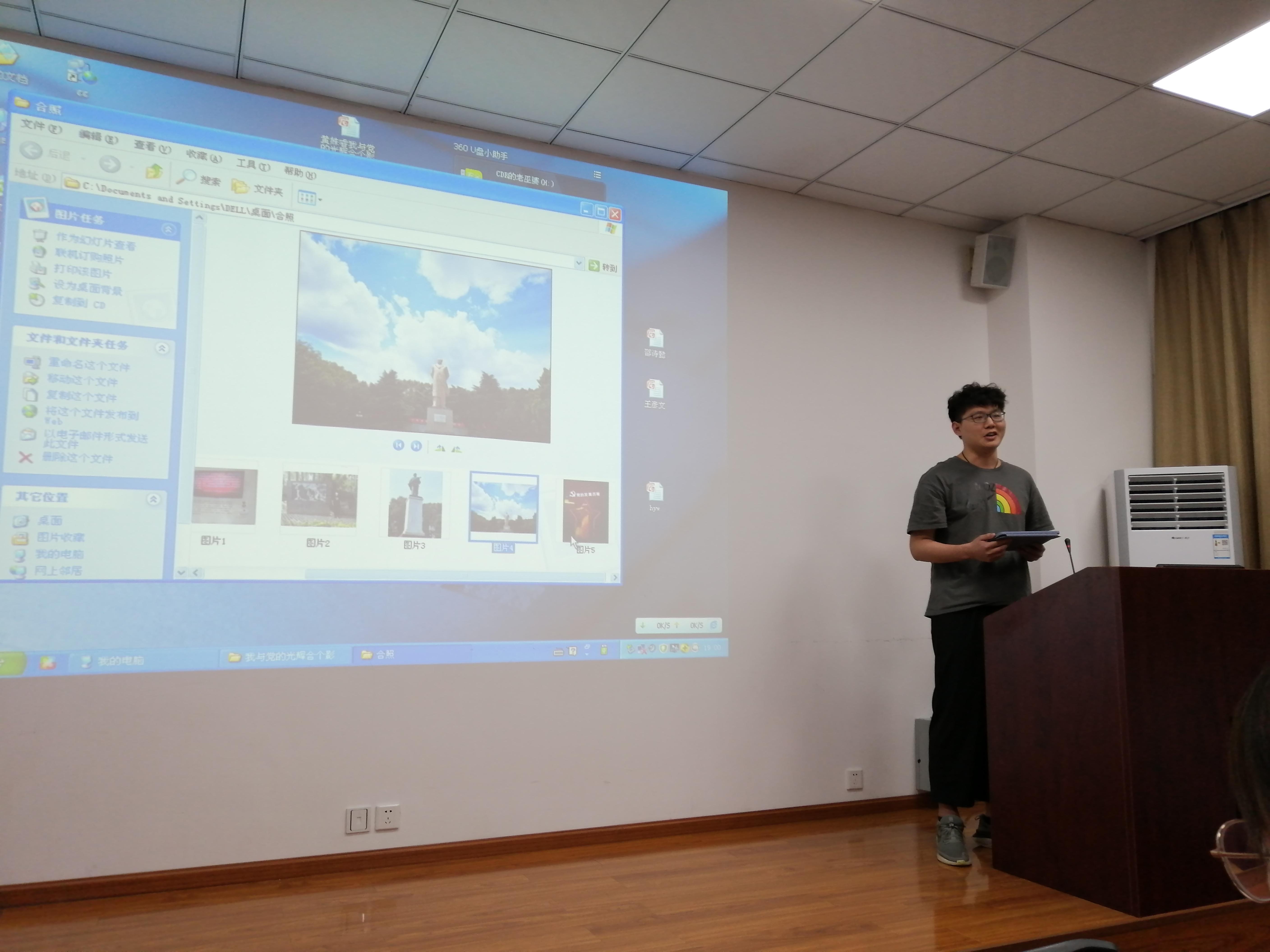 黄姝睿同学则分享了不同视角下的毛泽东青年艺术雕像,雕像坐落于长沙橘子洲头,与周围环境完美结合,表现出一代伟人年轻时的崇高信念和宏图大志。梁昕怡同学分享的是在瑞丽边境所拍的照片,以瑞丽经济的发展为切入点分享了改革开放以来边境开放政策的变迁。毛雅宣分享的是成都博物馆所拍的参观照,表达了自己对党和国家的祝福。邵诗懿分享了不同时间点、不同视角下三张天安门前的照片,从交通工具的变迁之下感叹祖国经济交通发展之快。王彦文同志分享了自己在青岛五四广场所拍的照片,表明自己虽经历过一些挫折但从未放弃,回望当年五四运动时那群意气风发的青年学子,喊出“誓死力争,还我青岛”的口号,作为当代大学生的我们,也应当热爱党和祖国,为祖国发展贡献自己的一份力量。辛逸伦同学分享的是坐落于长沙的毛主席镀金雕像,就像席勒在诗中所写的“人要忠于自己年轻时的理想”,于我们也是如此,我们应当有理想地生活,回头望时才不算荒度一生。