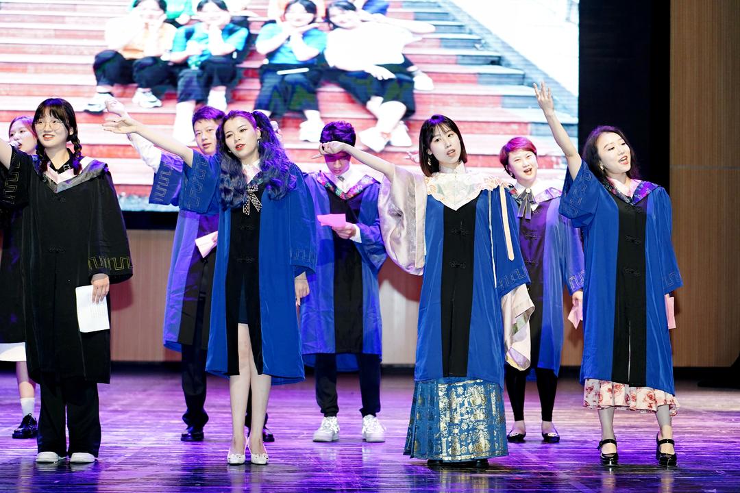 随后,师生代表合唱将毕业典礼气氛推向高潮。法学系杨道现老师、政治系袁智老师与公共管理系代佳欣老师,与同学们精心准备、倾心演出,奉上一场精妙绝伦的歌曲串烧。在《风吹麦浪》的缤纷夏季,大家相聚《成都》,共同祝福每一位同学都拥有《一路生花》的美好未来。
